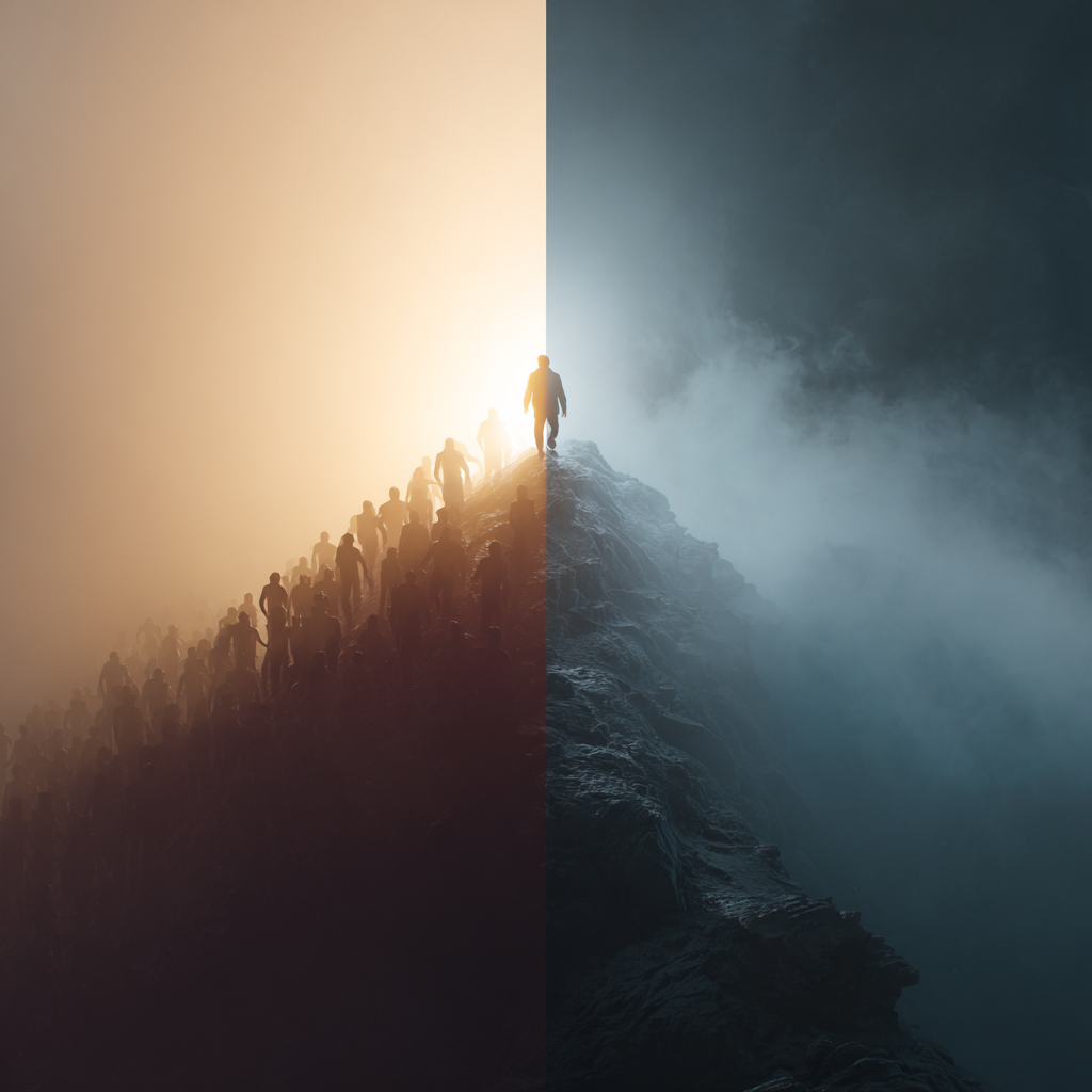 Un homme debout sur un piédestal, baigné d’une lumière dorée aveuglante, le visage qui se fissure comme de la pierre, les gens autour disparaissant dans l’ombre — métaphore du pouvoir qui révèle le vide intérieur — clair-obscur, composition cinématographique, tons or et bleu froid.